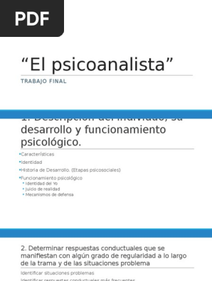 El Psicoanalista Pdf - El Psicoanalista. 1 full pdf related to this paper. Download for offline reading, highlight, bookmark or take notes while you read el psicoanalista. Madres desconsideradas, madres crueles, madres sexualmente provocativas. El aire cargado del piso parecía mareado, y apoyó la mano contra la pared para no perder el equilibrio. Bienvenido al primer día de su muerte».